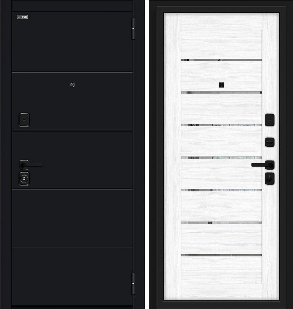 Надежная входная Дверь Браво Прайд Total Black/Snow Melinga премиум класса по цене 39 849 руб. Большая толщина стали защитит от проникновения в ваш дом, квартиру или коттедж. Используется очень качественная фурнитура: замки, цилиндры, ручки, защелки. Покрытие и отделка двери изготовлено под внимательным контролем производителя. Дверь имеет долгий срок службы и гарантию.